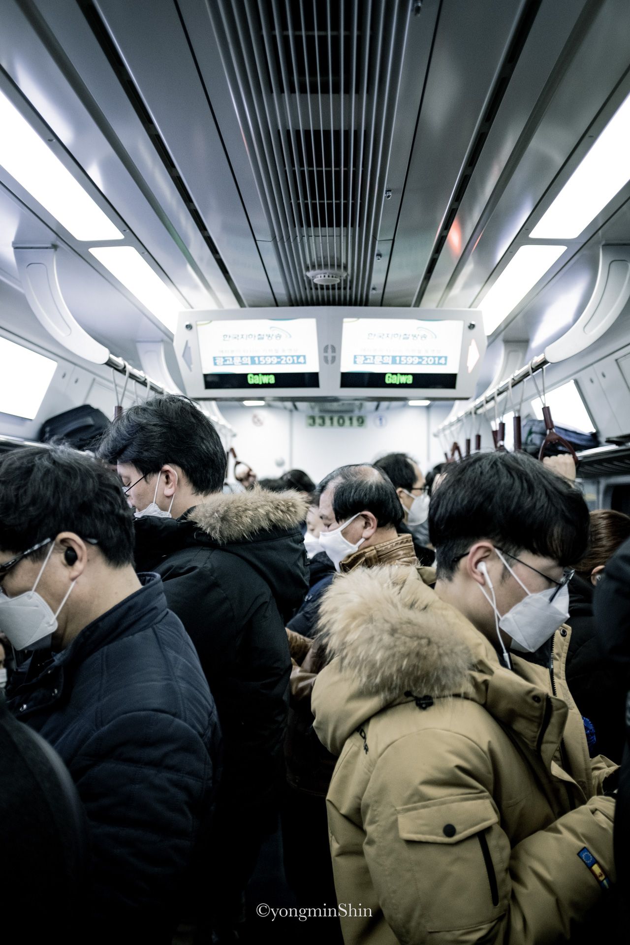 Everyone in masks, absolute silence. Subway to Gajwa Station, Seoul, South Korea.Fujifilm X100F